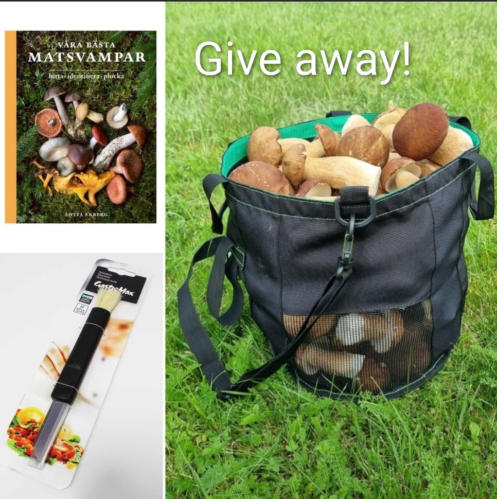 En hopvikbar svampväska plus en svampkniv och boken *Våra bästa matsvampar,