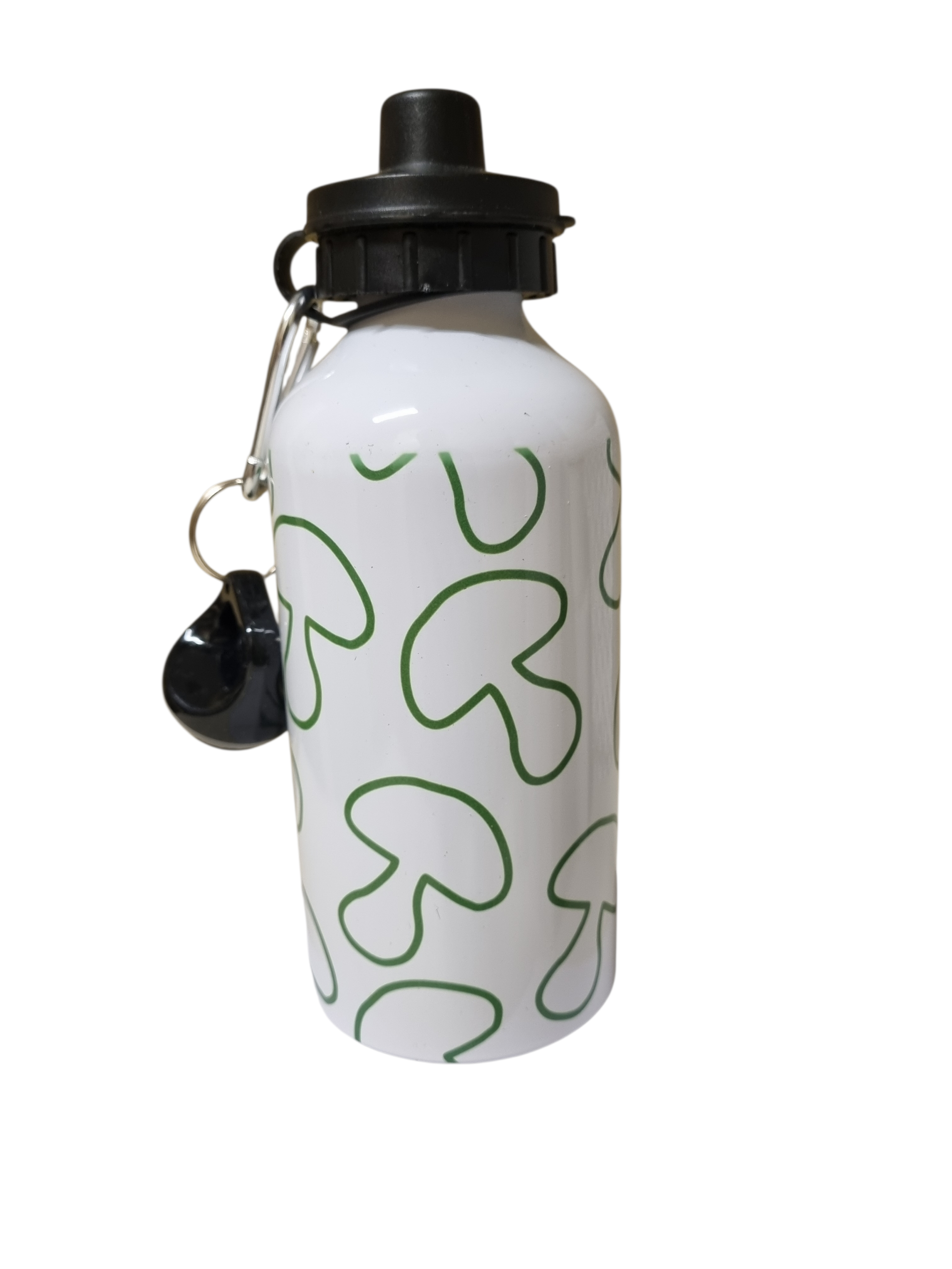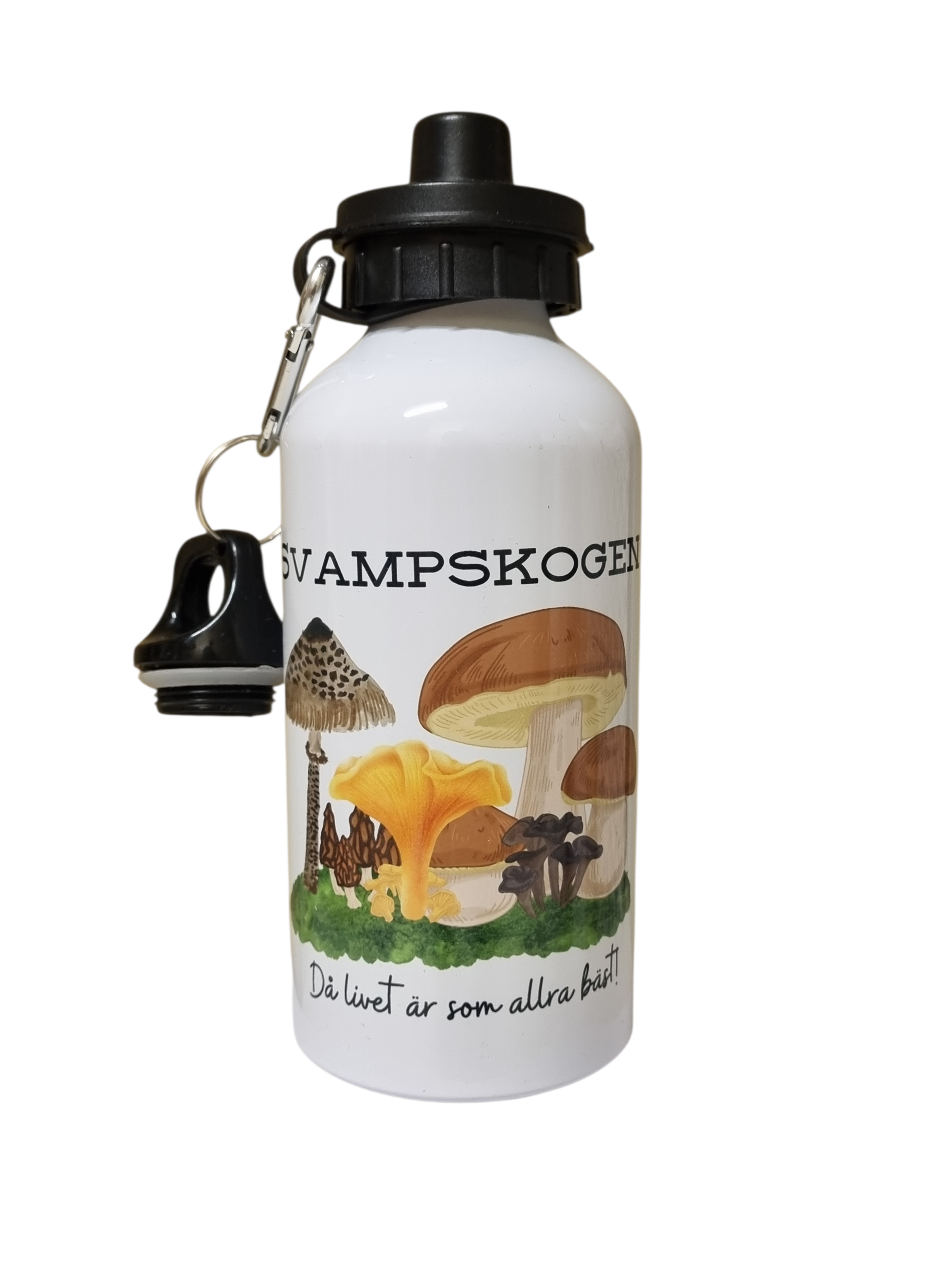 Vattenflaska i aluminium. Två olika förslutningar medföljer, en skruvkork samt ett drickmunstycke med lock.