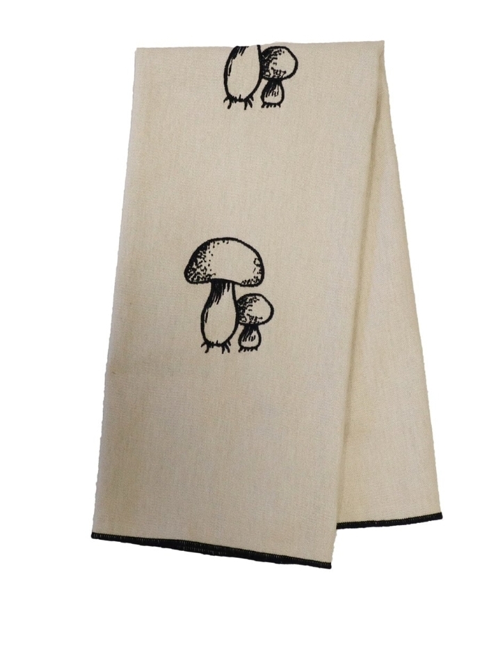 Kökshandduk med broderade svampar, med languette söm runt. Svensk design.
